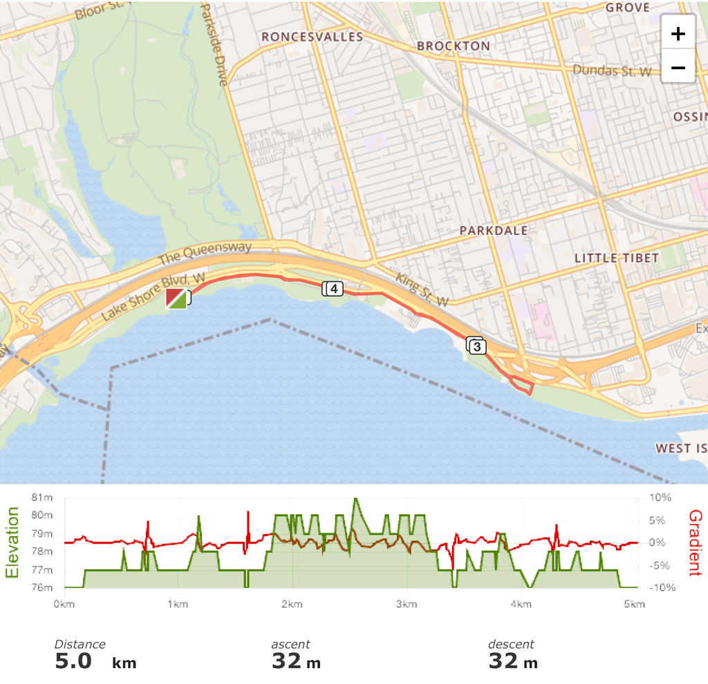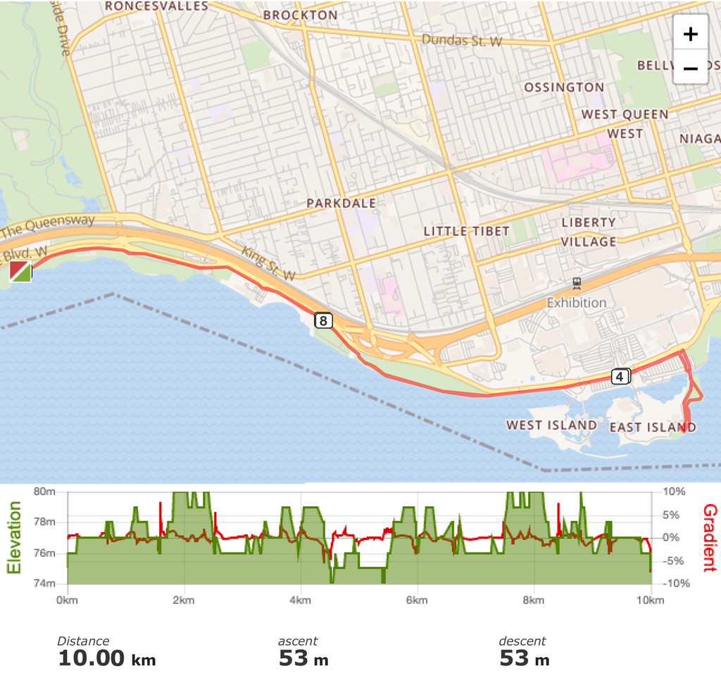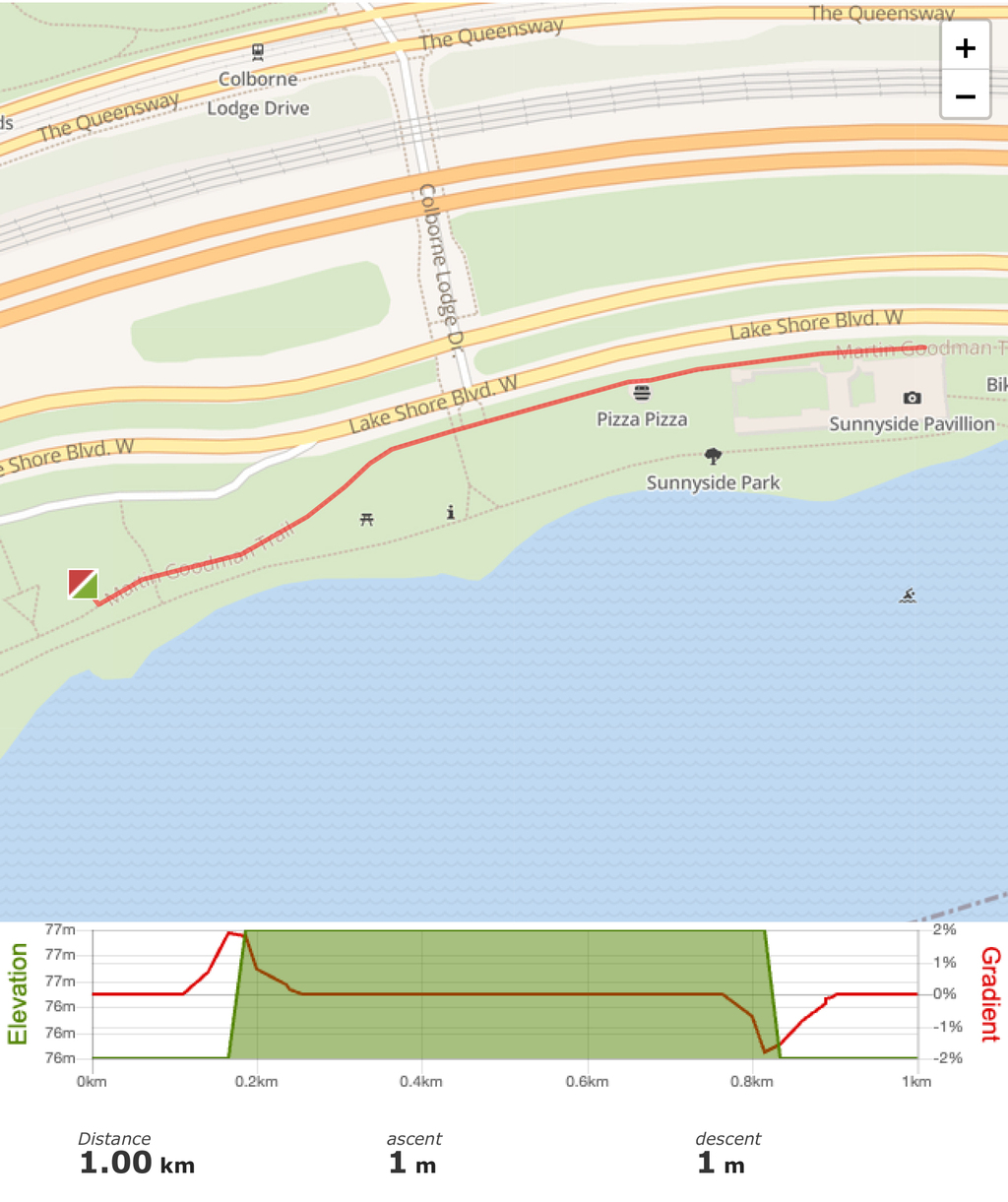 The Toronto Carnival Run is an out and back route that begins at Sir Casimir Gzowski Park and heads East along the Martin Goodman Trail.